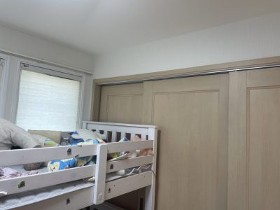 今回は、もともと引き戸でつながっていたお子さま部屋に新しく壁を設け、完全に二部屋として分けて使えるように工事を行いました。
