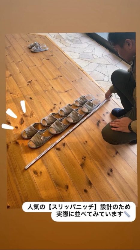 ▲ニッチにスリッパを収納したい!というご要望が。実際に形にするため、工務の橋本さんがサイズを測り、図面に起こしていました。